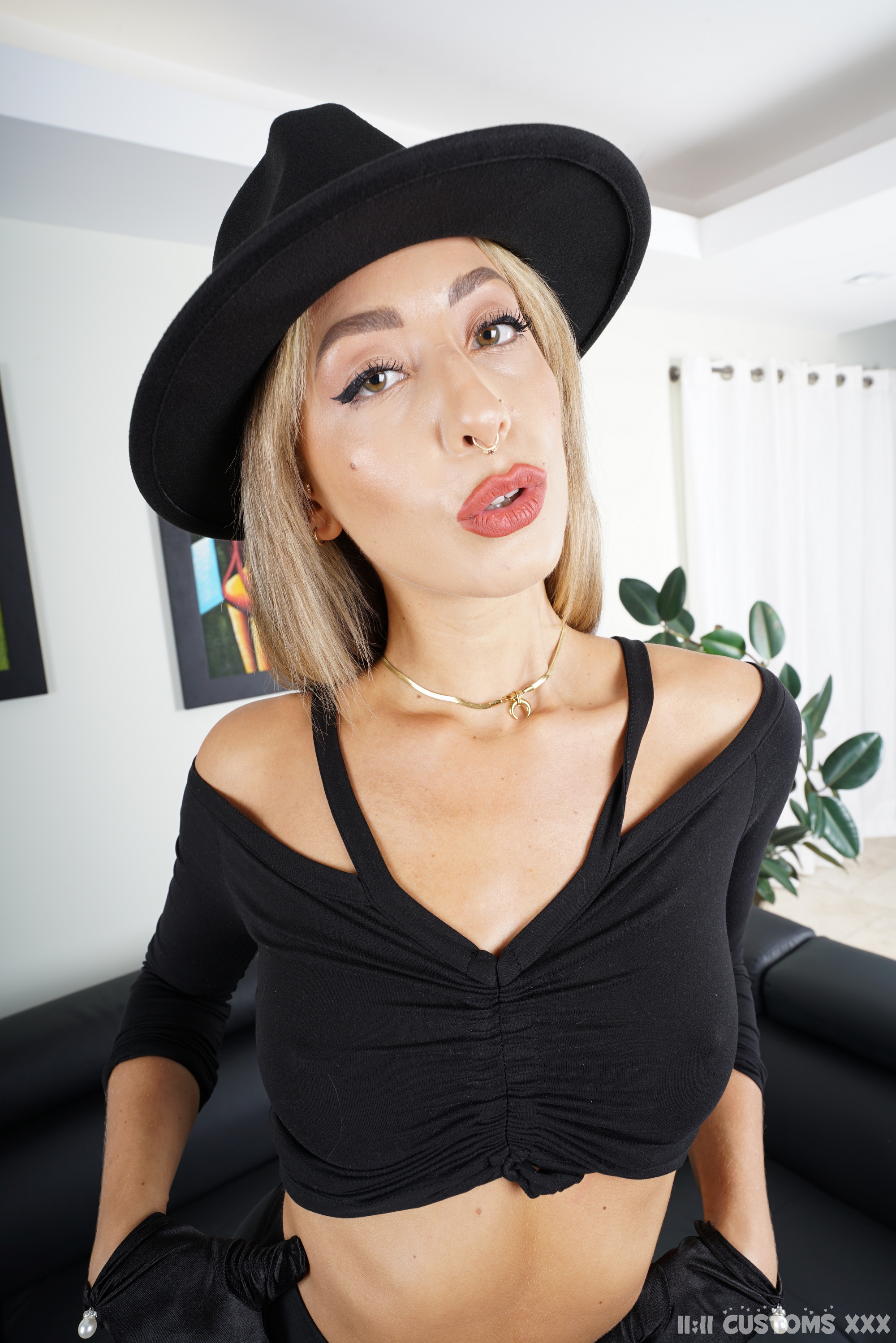 Amateur Aluni shows off her sexy black la those legs and sexy black gloves..