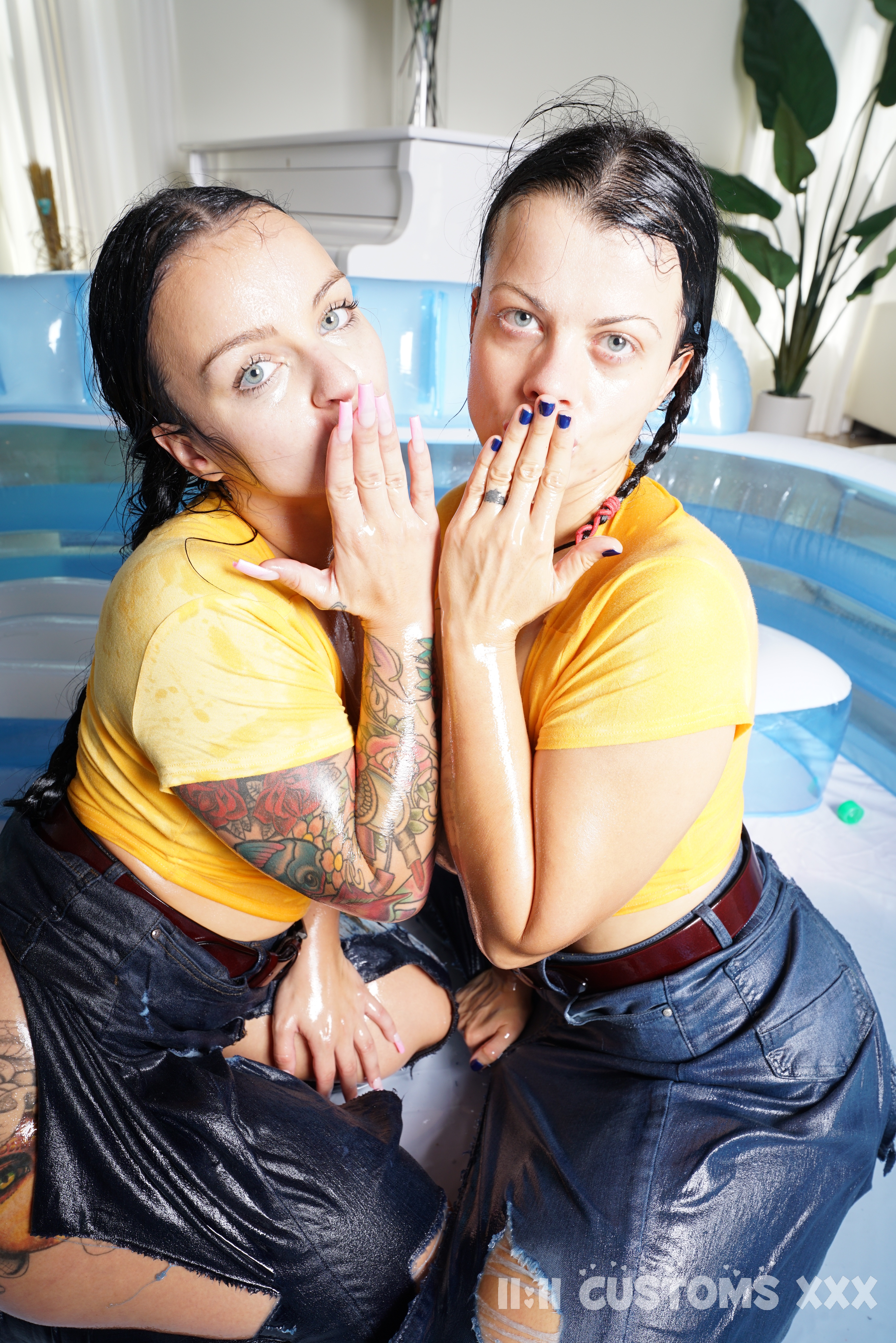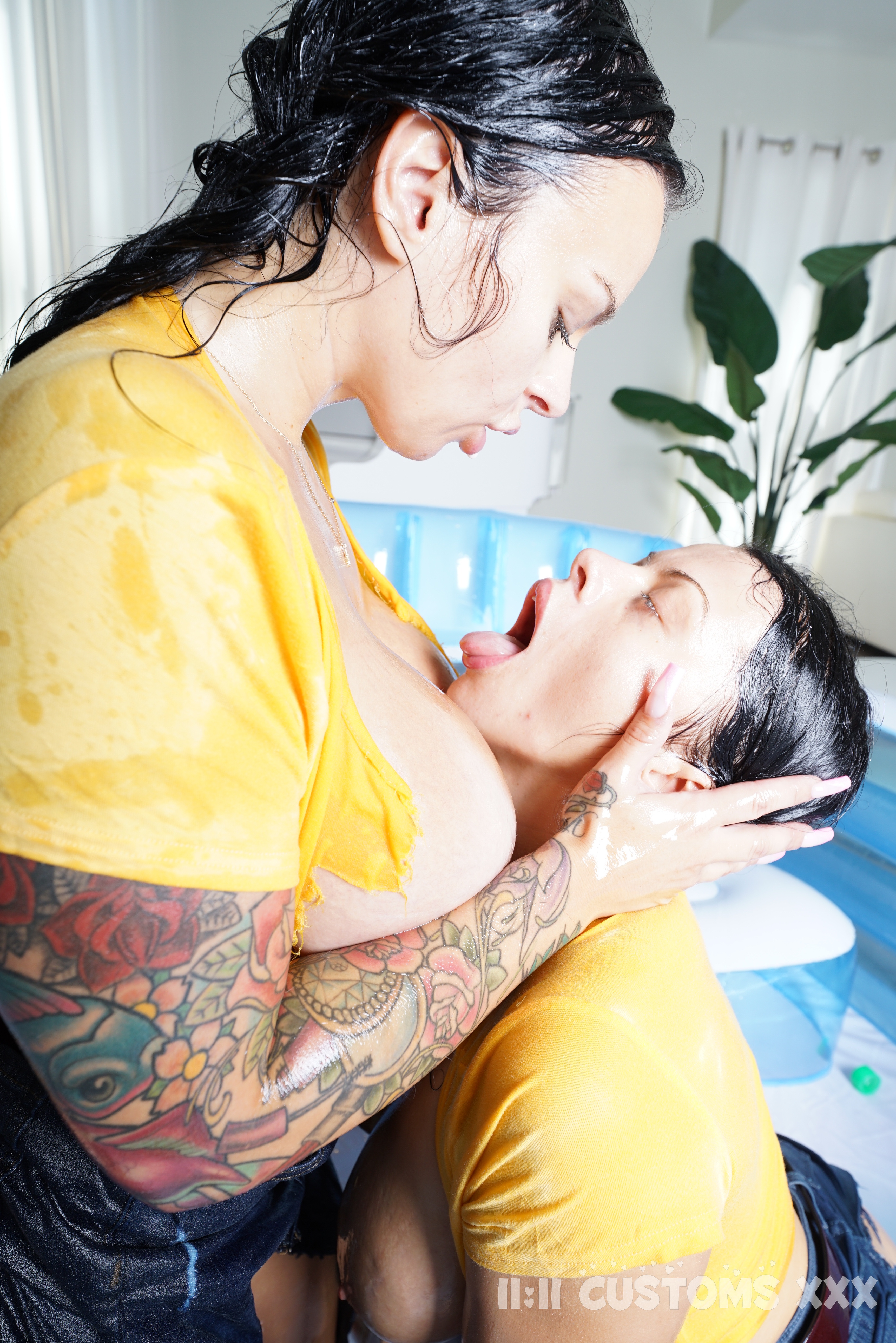 the dispute with some oil wrestling in the pool, then tear their pants to go down on each other's